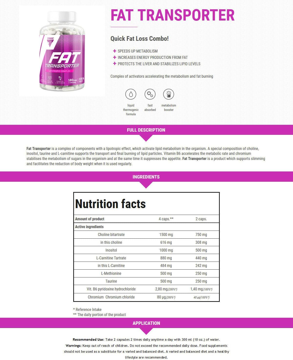 Contains choline, inositol, taurine, L-carnitine, chromium and vitamin B6Choline favors the correct metabolism of fatsChromium helps maintain the correct level of blood sugarFAT TRANSPORTER contains choline, inositol, taurine, L-carnitine, chromium and vitamin B6. Choline contributes to normal metabolism of fats and supports functioning of the liver. Vitamin B6 contributes to normal energy production and it participates in the metabolic processes of protein and glycogen. Chromium contributes to maintaining normal blood sugar levels.